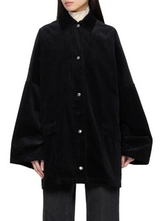 This Totême jacket is a stunning example of minimalist chic, crafted from luxurious, textured fabric with a plush finish. The deep black colour enhances its versatile appeal, making it a perfect layering piece for any ensemble. Its oversized silhouette and sharp collar exude a contemporary yet timeless style, while the large patch pockets not only add functional detail but also a touch of casual elegance. Button closures provide a clean line, adding to its sleek look.