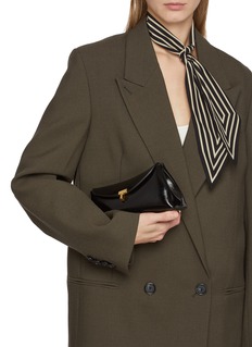 The TOTEME T-Lock bag revisited as a mini clutch to nestle in the hand alongside evening edits. It is crafted in Italy from shiny naplack leather with a T-Lock twist clasp and an internal card slot.