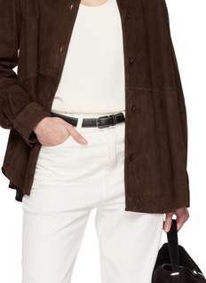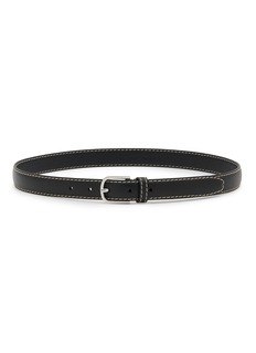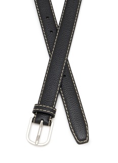 Discover the epitome of minimalist chic with this Toteme leather belt. Its sleek black finish is enhanced by contrasting white stitching, adding a subtle yet striking detail. The silver-toned buckle provides a classic touch, making it an ideal accessory for refining any outfit. Whether cinching a dress or elevating a pair of trousers, this belt blends functionality with a modern aesthetic.