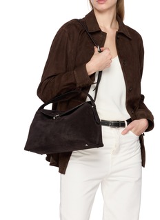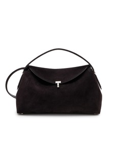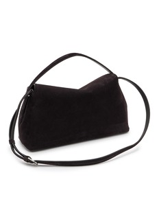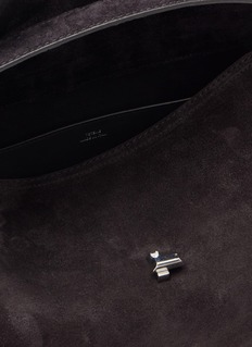 Indulge in the luxuriously crafted Toteme suede bag, a testament to minimalist elegance with its soft black suede and distinctive half-moon silhouette. The design is accentuated by a polished silver-tone bar clasp that not only secures your essentials but also adds a chic, metallic contrast. Its adjustable strap offers versatile styling options, making it perfect for any occasion, from casual outings to more formal events.