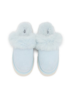Step into a cloud of comfort with the UGG Fluff Yeah Slide, rendered in a serene blue hue that evokes a sense of calm and relaxation. This slipper combines a luxuriously soft sheepskin lining with a smooth suede upper, crowned with a fluffy sheepskin strap for an added touch of whimsy. Its chunky platform sole ensures durability and comfort, making it ideal for both lounging indoors and stepping out for light activities. Indulge in the cozy charm of these must-have slippers.
