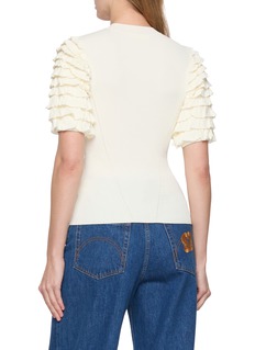 A sculptural take on everyday knitwear, the Kassia top sharpens Ulla Johnson’s romantic codes into a modern, structured silhouette. The finely ribbed body skims the figure, while the sleeves erupt into tiered ruffles that create volume and movement—ideal for elevating denim or grounding a statement skirt.