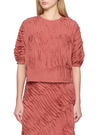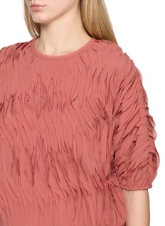 This Ulla Johnson blouse captivates with its unique texture and soft rose hue. The artful pleating creates a dynamic, rippled effect that adds depth and movement, enhancing the silhouette. Finished with gently puffed sleeves, this piece merges contemporary fashion with romantic detailing.