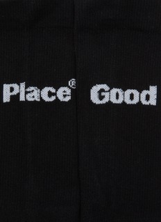 Add a sleek touch to your ensemble with these UNNA black socks, prominently featuring the playful words 'Good Place' in contrasting white text. These socks are meticulously crafted from a soft, breathable cotton blend, ensuring comfort throughout the day. Their ribbed design offers a snug fit, while the minimalistic color scheme makes them a versatile option for pairing with both casual and sporty outfits.