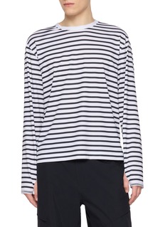 UNNA's striped running T-shirt features dropped shoulder sleeves with thumbholes. It has a water-based sublimation-printed stripe pattern and is made from quick-drying, post-consumer recycled polyester with 4-way stretch for flexibility, and perforations for ventilation and breathability. A bold, hand-drawn UNNA text on the back infuses the piece with a rebellious touch.