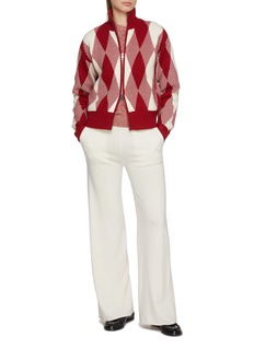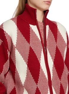 A polished layer with graphic depth, this knit jacket is defined by its diamond jacquard and tactile Ottoman stitch through the body. Ribbed trims frame the silhouette, while the zip-through front makes it effortless for layering—ideal for crisp days styled over tees or fine knits.