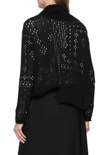 Light yet sculptural, this Y’s cardigan reinterprets classic knitwear through an open-knit construction and a distinctive draped front. The cropped silhouette closes with off-centre buttons, creating fluid movement and a soft architectural line—perfect over crisp shirting or tonal layers for textural depth.