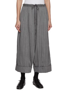 A relaxed reinterpretation of classic suiting, these pinstriped sarouel pants embody Y’s sculptural drape with a gathered waist and exaggerated volume. The wide, cuffed hems ground the fluid silhouette, inviting playful contrast with fitted tops or oversized knits.