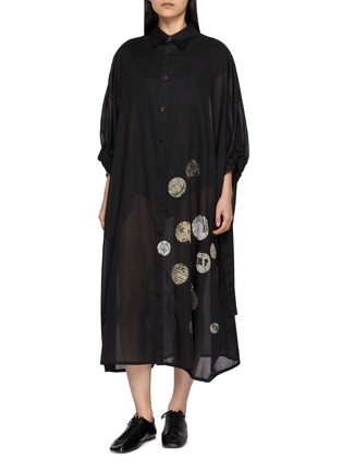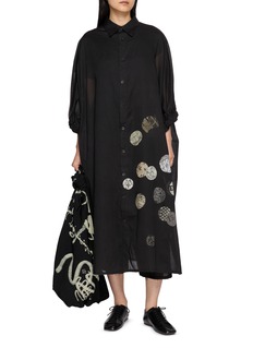 A study in lightness and movement, this Y’s shirt dress is rendered in a sheer, fluid silhouette that drapes with quiet drama. Gathered sleeves soften the structure, while scattered circular prints animate the dark surface with subtle graphic contrast. Layer it over tonal separates to emphasise its airy depth.