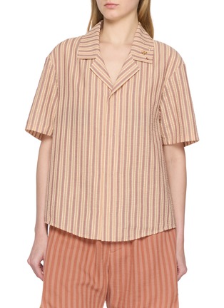 Soft vertical stripes lend a vintage sensibility to this oriental-inspired shirt, while young n sang punctuates the collar with delicate head bead embellishments. The relaxed cut and open neckline create an effortless drape—wear it loose over matching shorts for a coordinated resort statement.