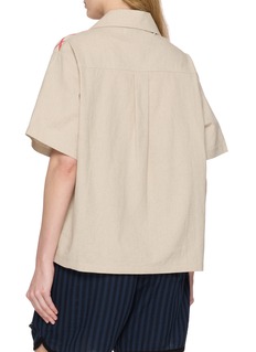 A study in contrast, this patchworked shirt by young n sang juxtaposes floral tapestry motifs with bold chequered panels for an artful, collage-like effect. The asymmetric overlay and subtle hand-beaded accents introduce dimension, redefining classic shirting with a contemporary twist. Style it loose over striped shorts for playful harmony.
