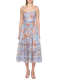 Romantic whimsy blooms in this Zimmermann floral midi dress, where delicate botanical embroidery dances across soft, flowing layers of sky-blue fabric. The scoop neckline and thin straps add a touch of vintage charm, while the eyelet embroidery and flared skirt create movement and grace. A dreamy statement for those who embrace effortless femininity.