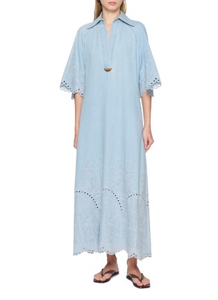 Ethereal elegance takes form in this Zimmermann denim midi dress, where intricate lace embroidery cascades down the hem and sleeves, transforming classic denim into a work of art. The V-neckline and flared sleeves add a touch of drama, while the soft, flowing silhouette ensures effortless grace.