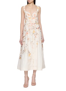 Zimmermann reimagines pastoral romance through this Luna Buttoned Picnic dress. Cut from breathable linen, it frames the silhouette with a plunging V-neckline and rouleau buttons, while a softly flared skirt moves with poetic ease—made for garden celebrations and long summer lunches.