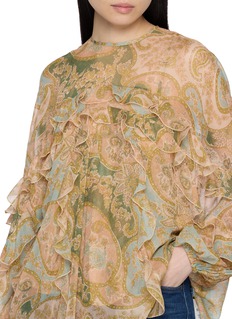 A romantic reverie from Zimmermann’s Spring 2026 “Kindred Spirit” collection, this Luna Flutter blouse drifts in airy silk, patterned in sage paisley. Cascading frills ripple across the bodice and sleeves, lending poetic movement—perfect for garden soirées or elevating denim with effortless grace.