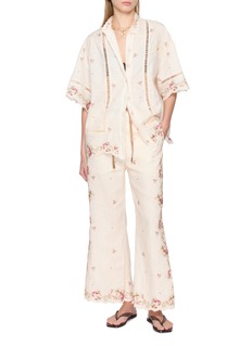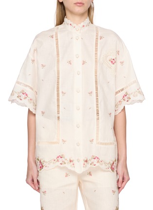 Zimmermann infuses an airy allure into your daily wardrobe with a soothing beige palette, where scalloped trims and charming heart-shaped buttons echo vintage artistry. Billowing sleeves and a stand collar bring gentle structure, making this shirt a poetic layer for warm-weather styling.