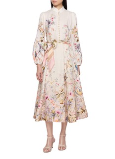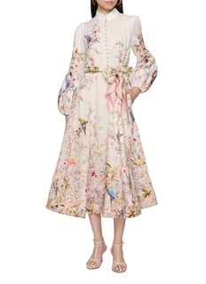 A poetic study in movement, this linen midi dress channels Zimmermann’s signature romanticism through painterly botanicals and a fluid, softly structured silhouette. Blouson sleeves and delicate buttons evoke vintage charm, while the removable scarf belt adds a sculptural accent that transforms the mood from languid daytime ease to refined garden-party elegance.